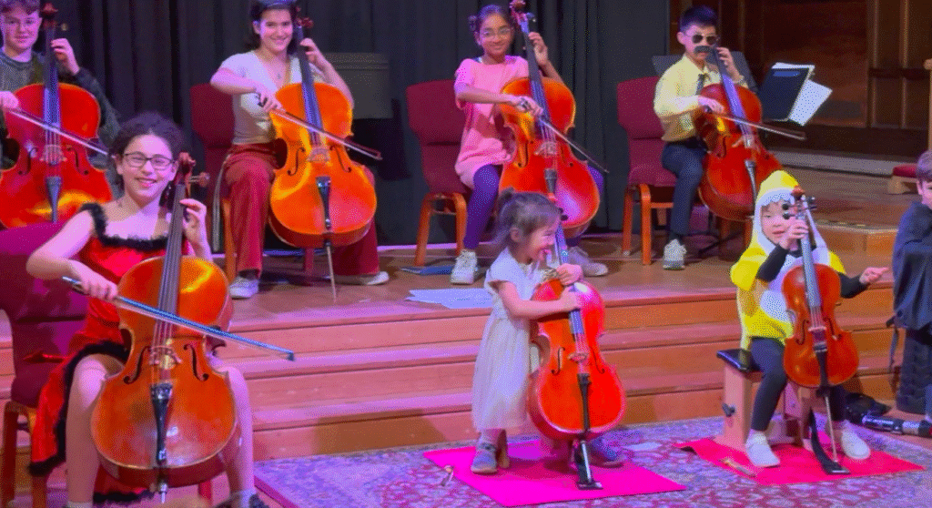 • cellists: normal notes, with huge bows, tone, and vibrato. Say/cry “AAAAAAHHHH!” on long notes. Advanced kids: Tremolo, or bass notes (below)